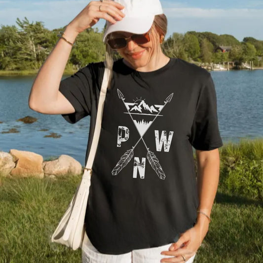 PNW Arrows and Mountains Hiking Softstyle Tee in White Letters