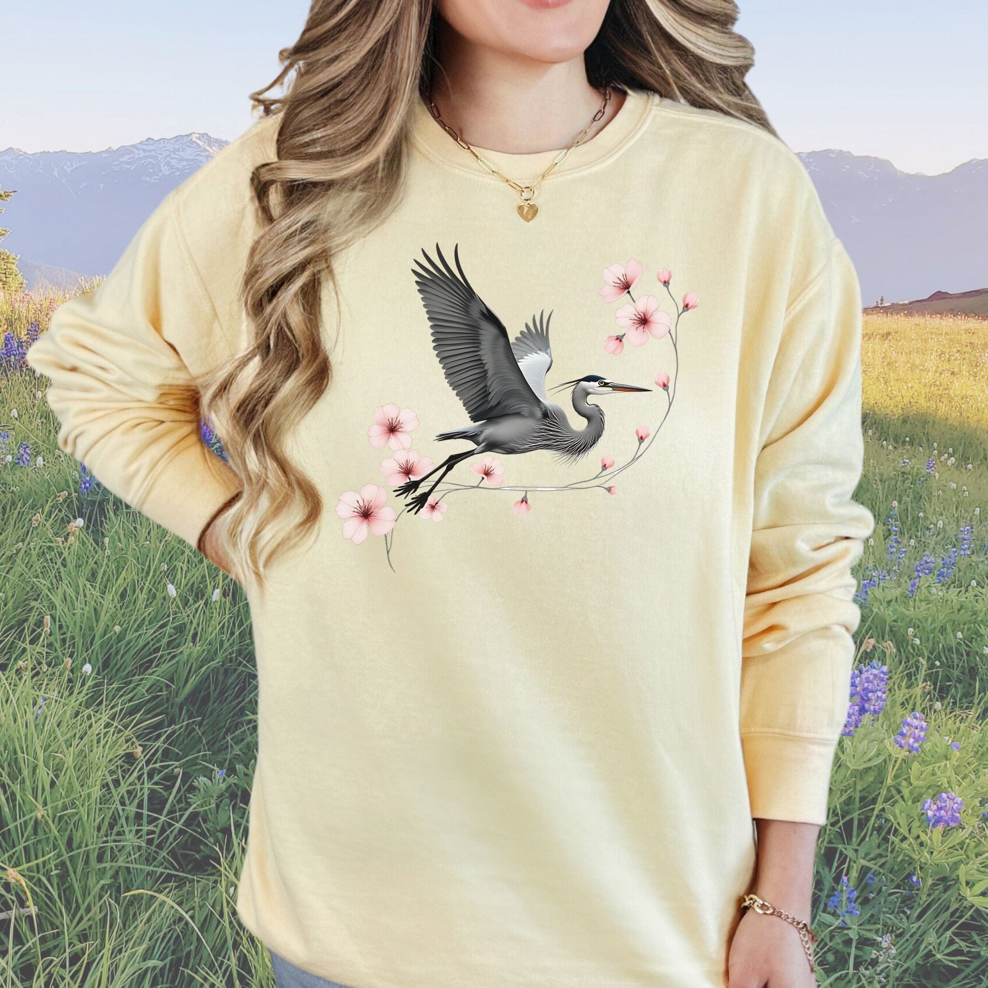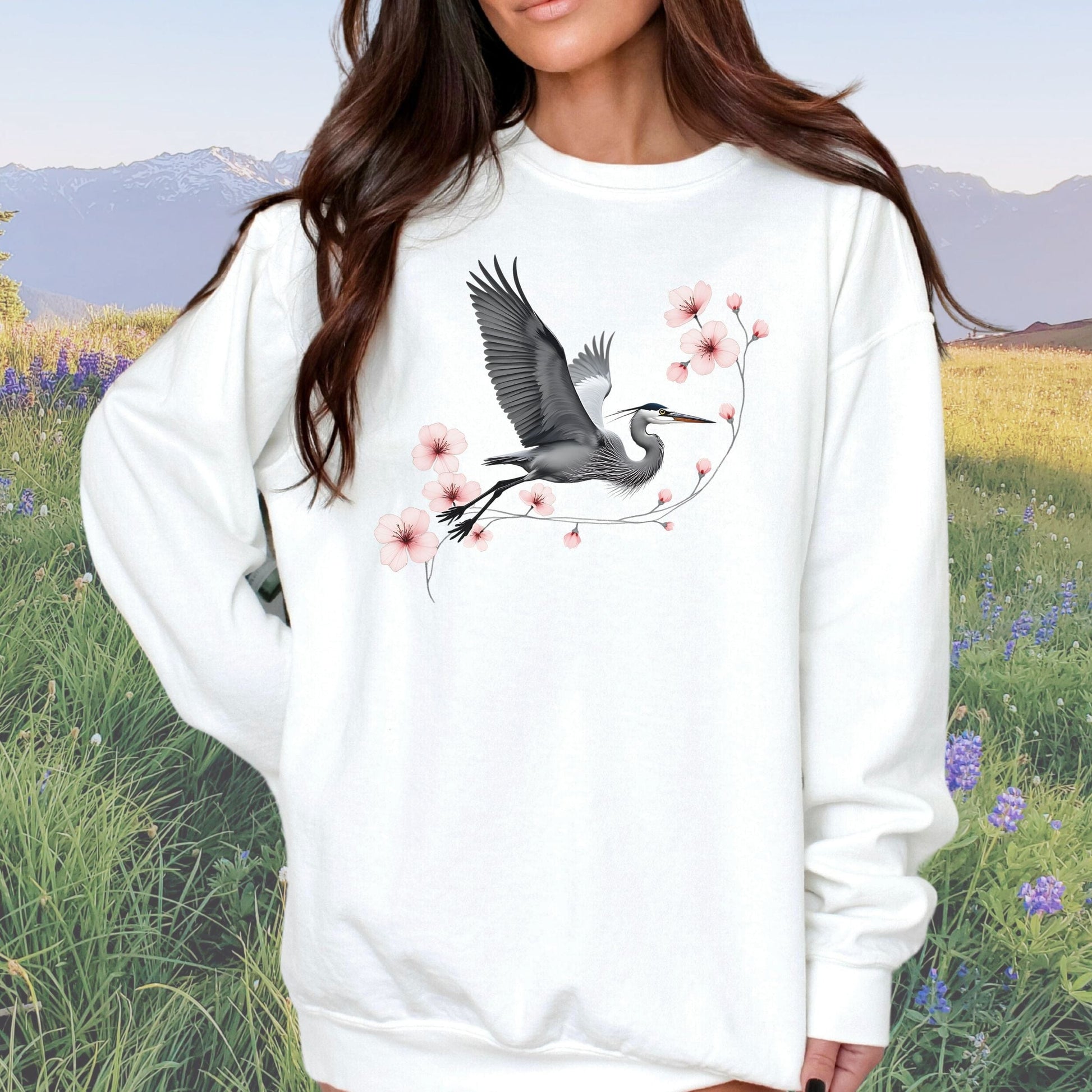 Fly into style with our Cherry Blossom Heron Flight sweatshirt. Embrace the vintage vibes with a unique blend of cherry blossoms and herons on a comfy Comfort Colors crewneck.