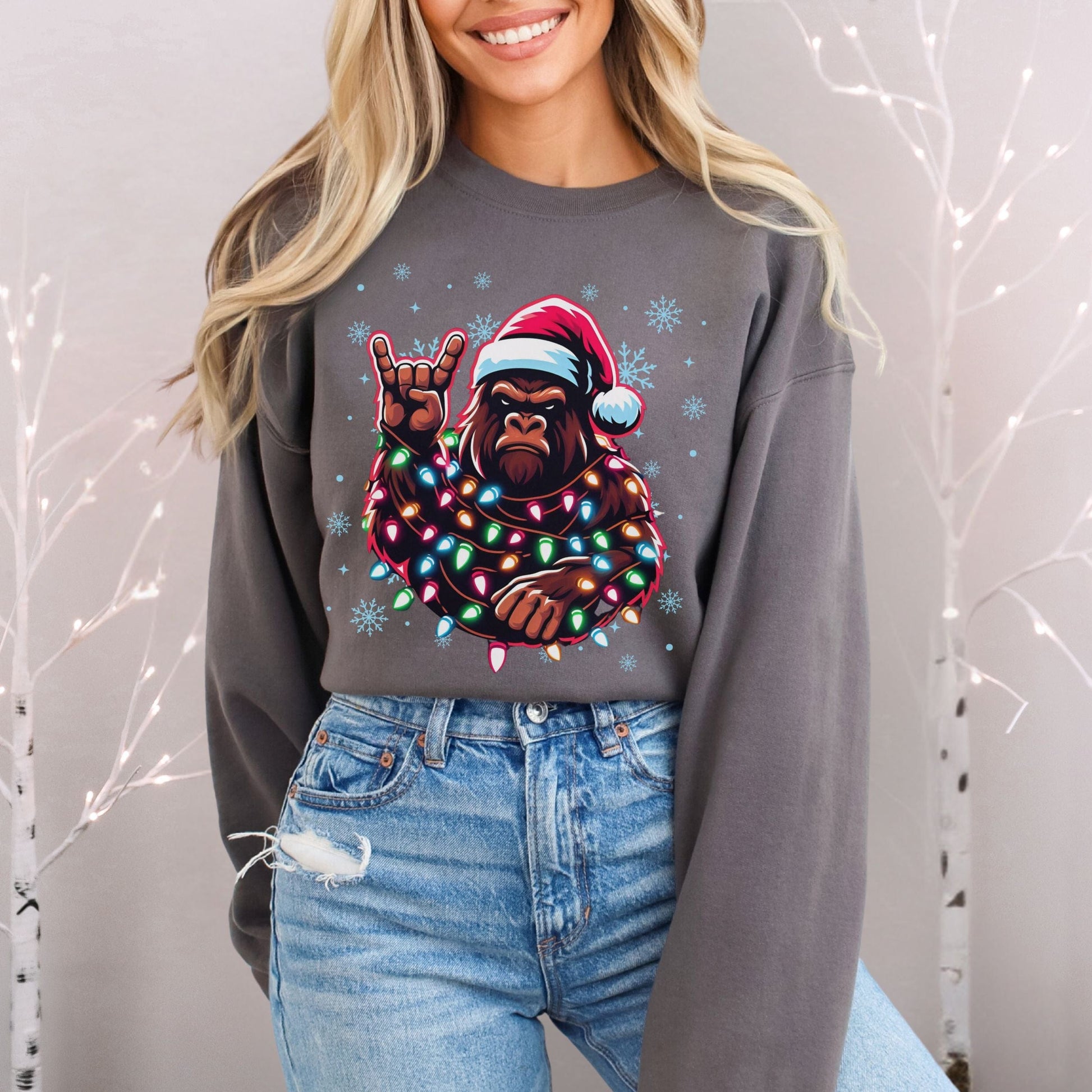 Stay warm and in style this holiday season with our Christmas Lights Bigfoot Sweatshirt! Featuring a playful design of Bigfoot wrapped in colorful Christmas lights, this soft and cozy sweatshirt will not only keep you warm but will also add a touch of fun to your wardrobe. Perfect for any festive occasion, this sweatshirt will surely make a statement and have others asking "Where did you find that?!"