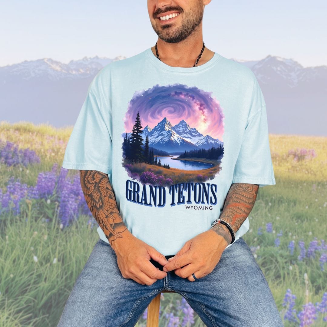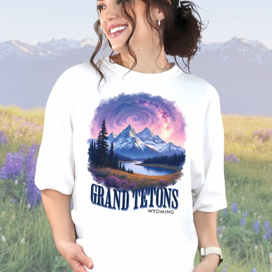 Unleash your inner stargazer with our Cosmic Grand Tetons tee. Featuring a vintage-inspired design, this t-shirt is a must-have for any cosmic enthusiast. Perfect for traveling, it also makes for a unique and stylish souvenir. Reach for the stars and upgrade your wardrobe with this one-of-a-kind shirt!