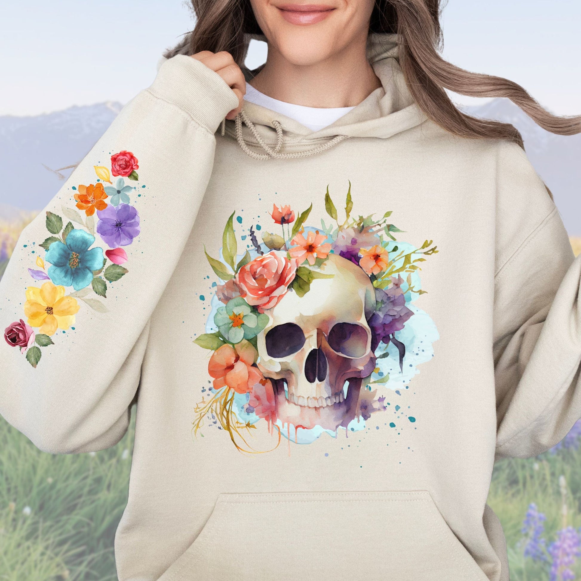 Floral Skull with Sleeve Design, Softstyle Hoodie