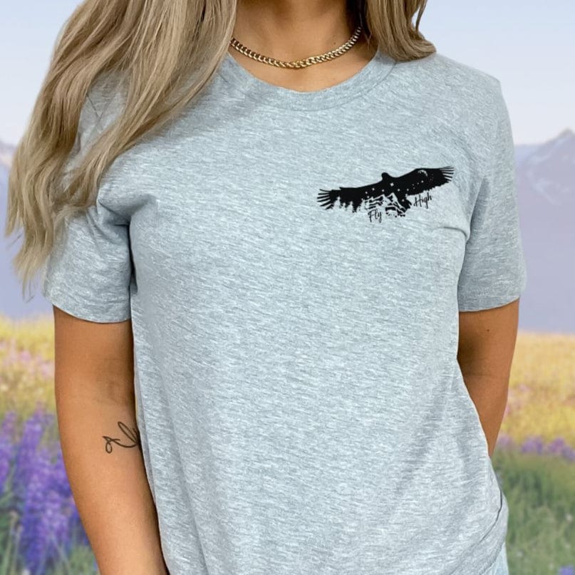 Get ready to soar with our Fly High Pocket Design softstyle tee! Featuring an eagle and majestic mountains, pocket design, this shirt is perfect for nature lovers. Show off your love for the great outdoors in style.