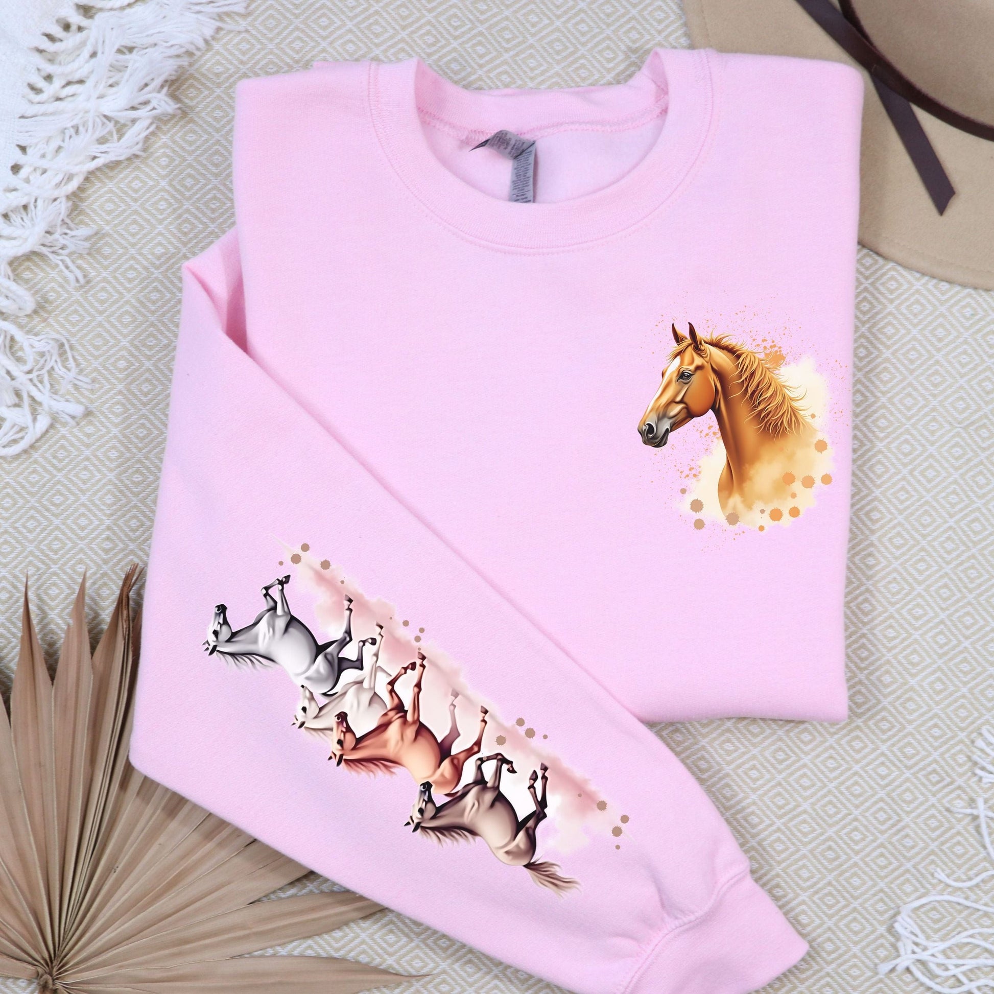 Show off your love for horses with this sweatshirt! Featuring a pastel watercolor horse design on the pocket and sleeve, this softstyle sweatshirt is perfect for any horse enthusiast. Stay cozy and stylish with the galloping horses sweatshirt!