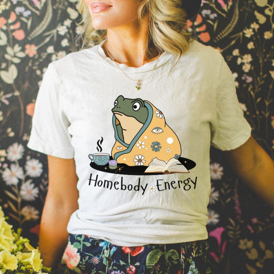 Transform into a cozy Homebody Energy Frog with this quirky t-shirt! Perfect for all you homebodies out there, this soft style tee offers a fun and playful way to embrace your love for staying in. No need to hop around, this frog has got you covered!
