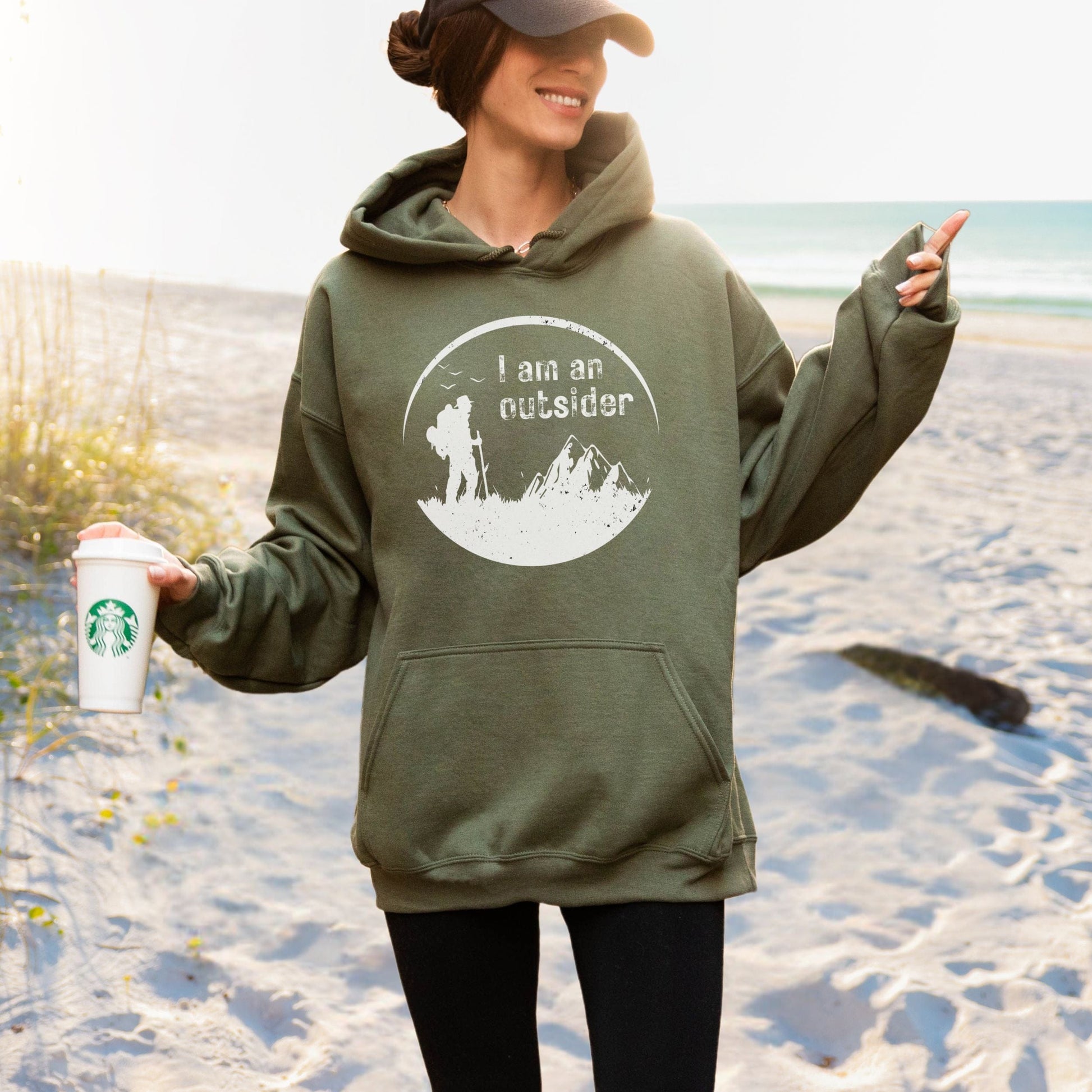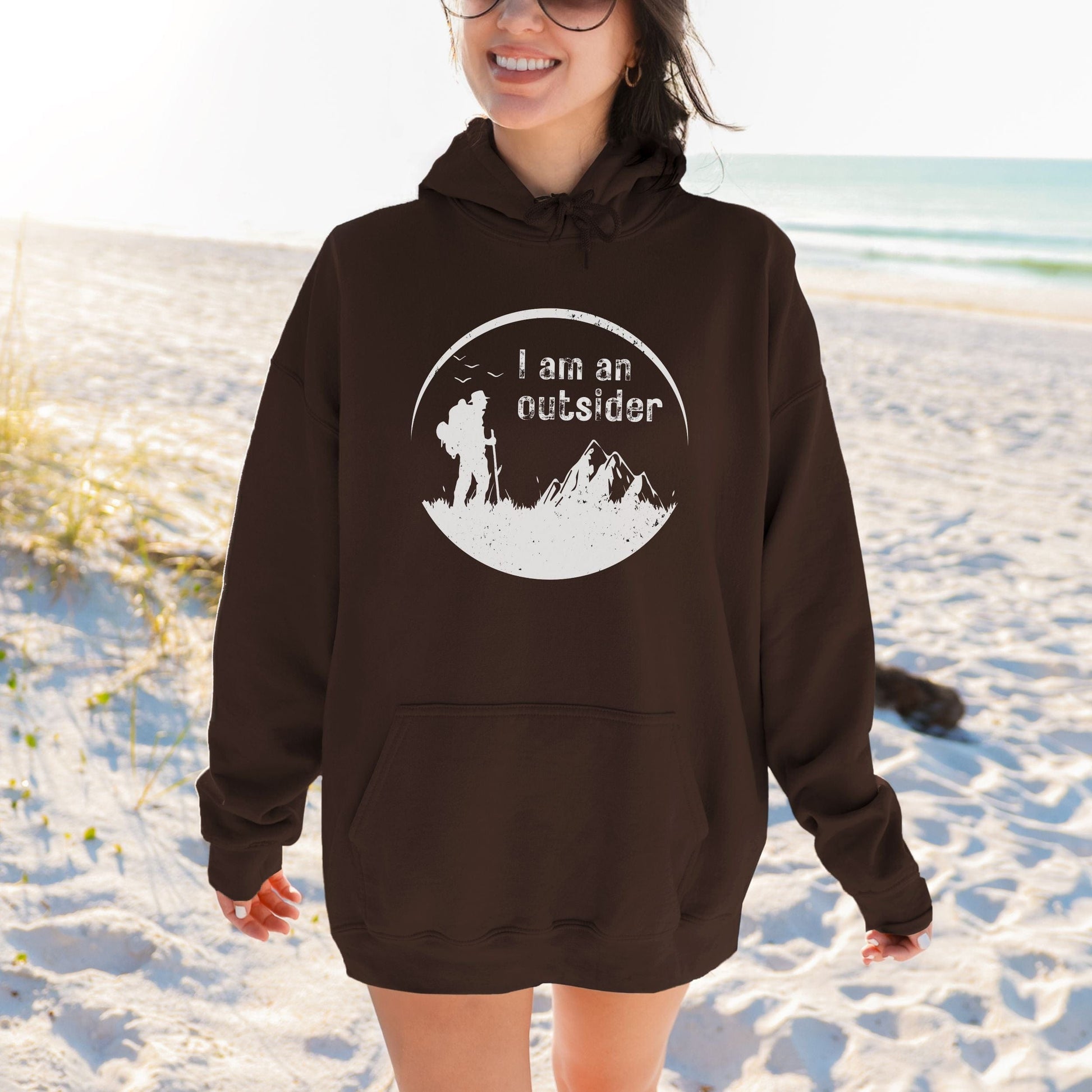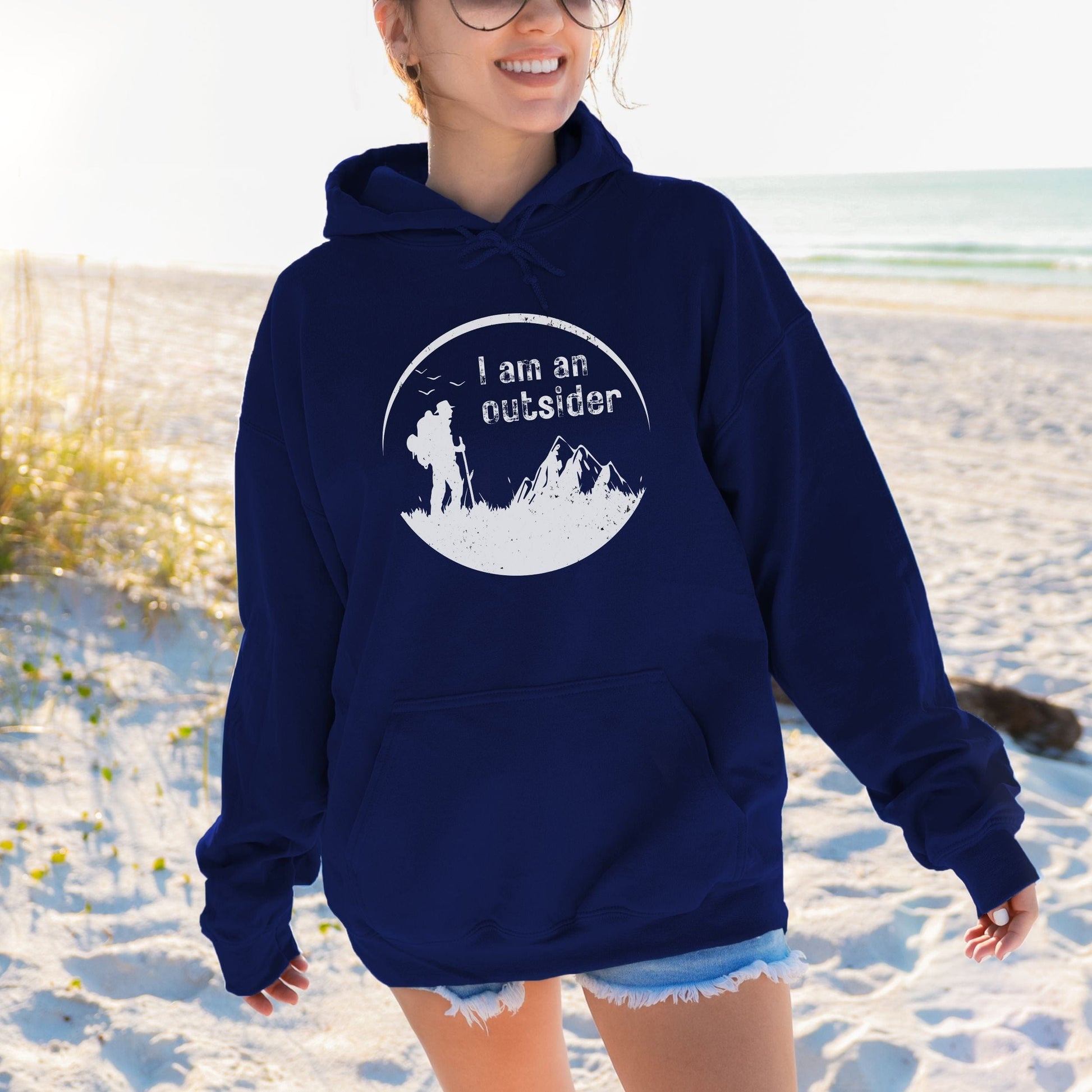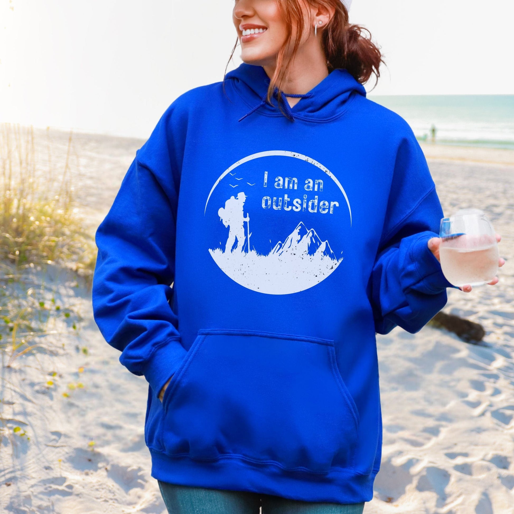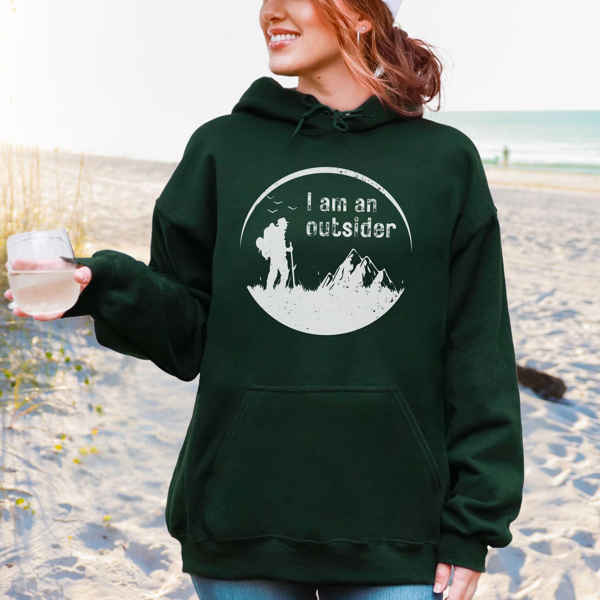 Mountain adventure hoodie for outdoor enthusiasts with the quote 'I am an outsider'. This cozy and warm hoodie is perfect for staying comfortable during outdoor activities and adventures. Suitable for adults who love exploring nature and seeking new experiences. Relevant for camping trips, hiking excursions, and outdoor festivals.