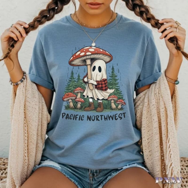 Pacific Northwest Rainy Day Ghost & Mushroom Vintage Style Tee