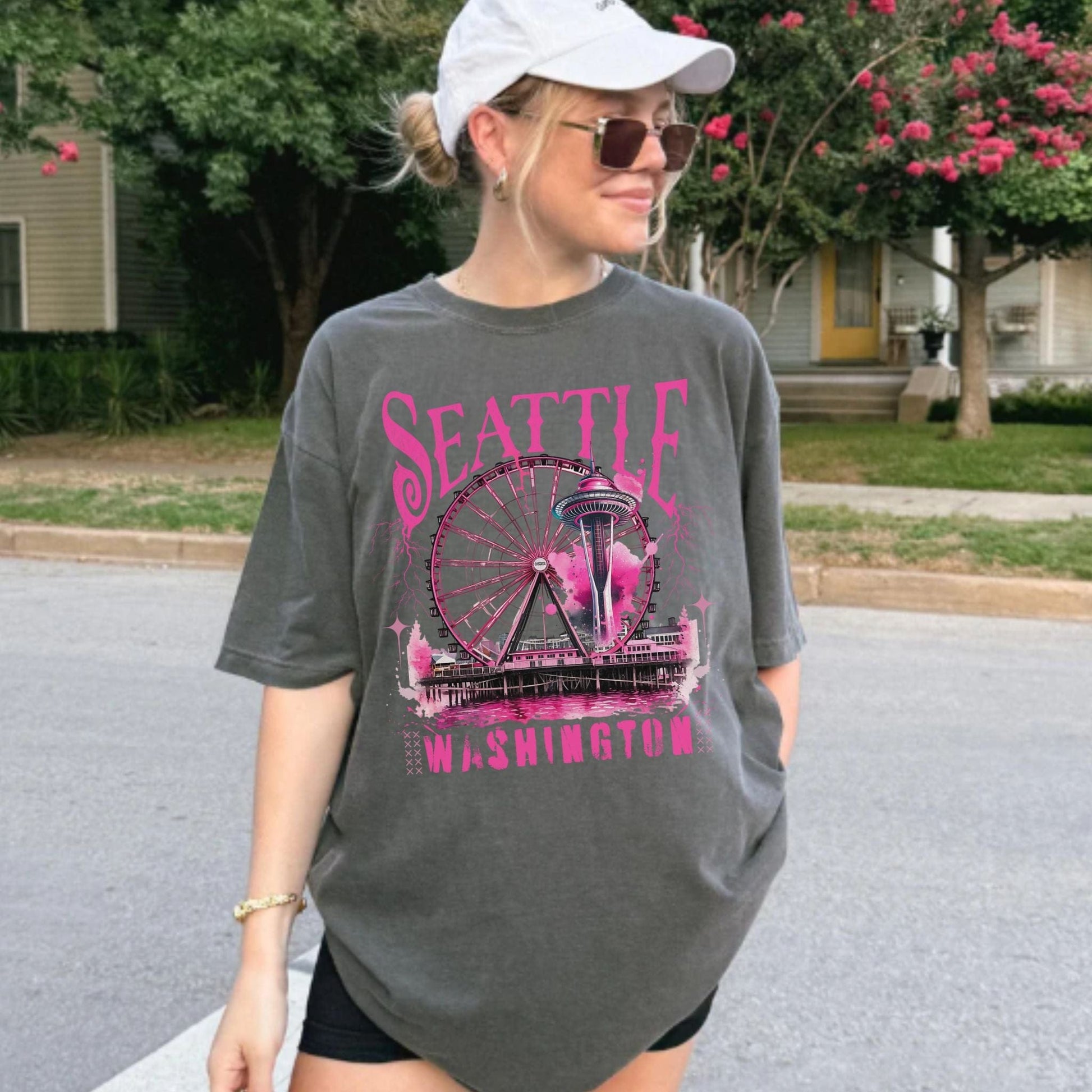 Get ready for your travels through Jet City with this Pink Seattle Wheel, Vintage Style Tee. This eye-catching t-shirt features a playful pink cityscape design, perfect for showing off your quirky style. Rock this unique tee and stand out in the crowd as the ultimate Seattle Grunge Tee.