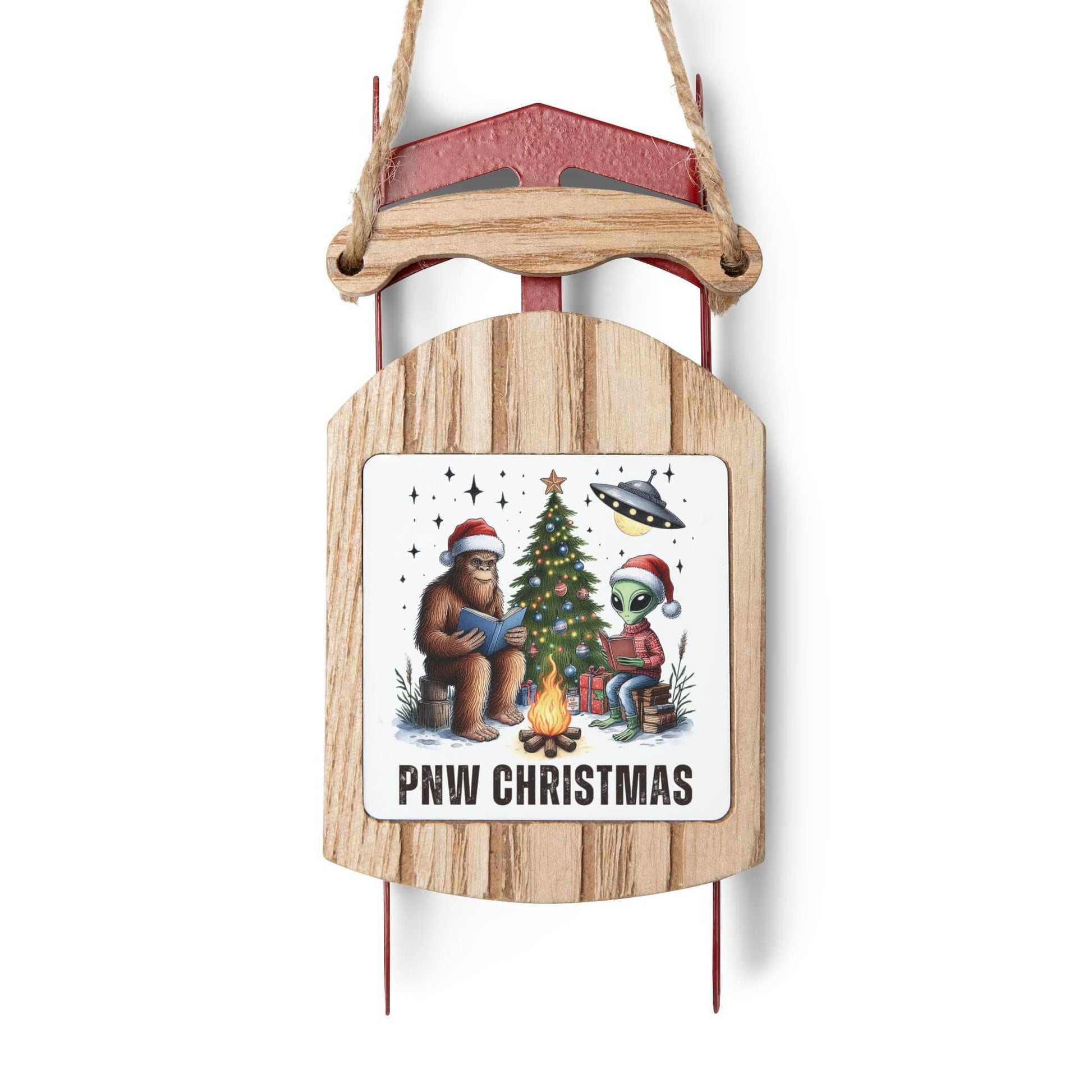 PNW Christmas, Bigfoot and Alien Campfire Sled Ornament