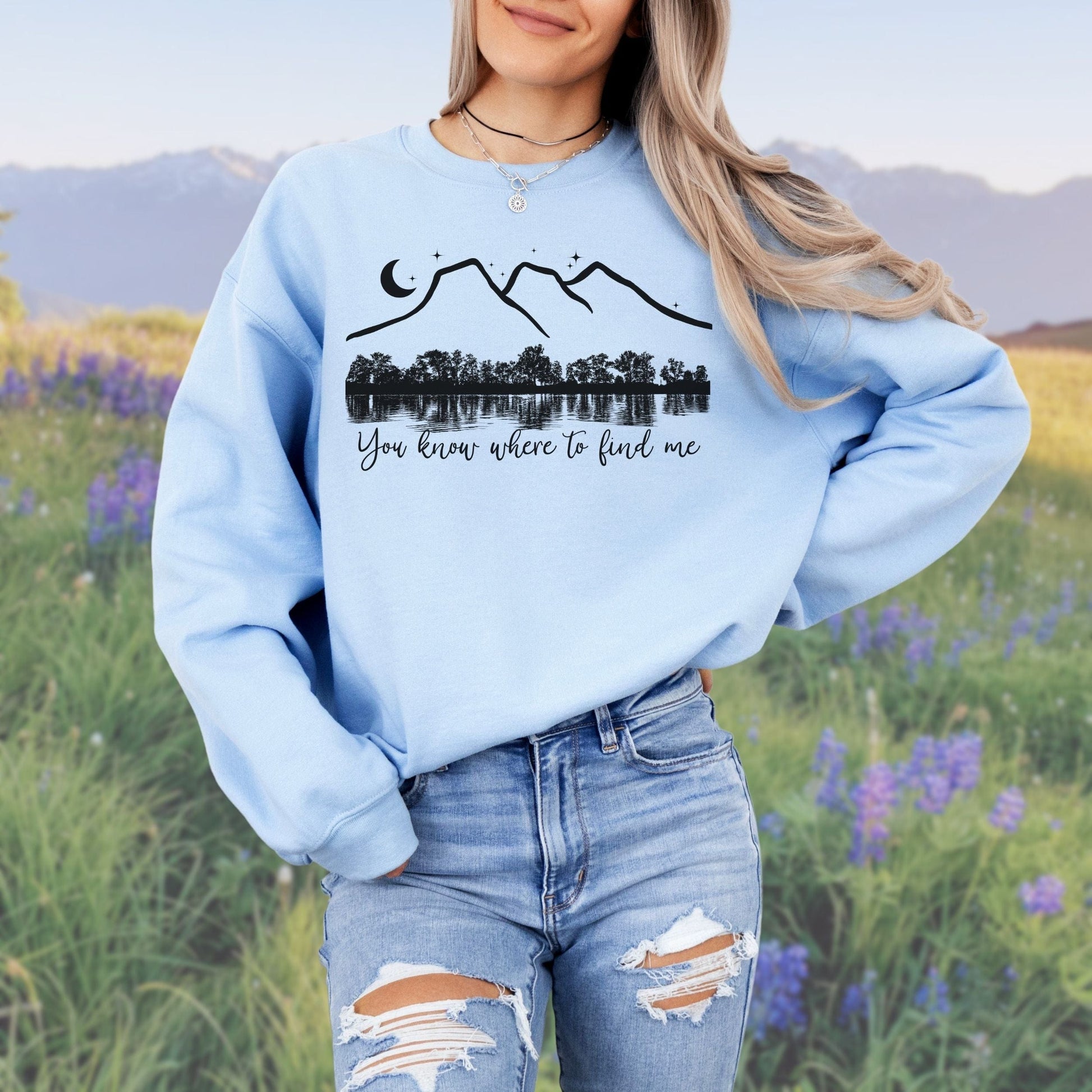 Get lost in the mountains with our You Know Where to Find Me Softstyle Sweatshirt. This cozy sweatshirt is perfect for outdoor lovers, keeping you warm and comfortable on all your adventures.